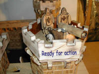 drawbridge and crank a mote, cannons, towers and walkways, a staircase, ladder,